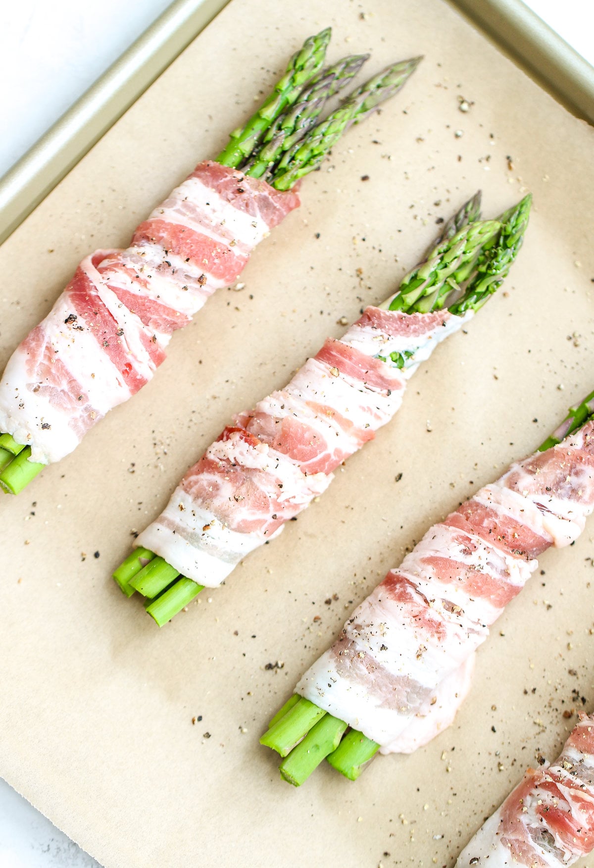 - Trim the ends of the asparagus off (about a 1/2 inch) and wrap 3-4 stalks with one slice of bacon to make a bundle. Repeat until all the asparagus is wrapped