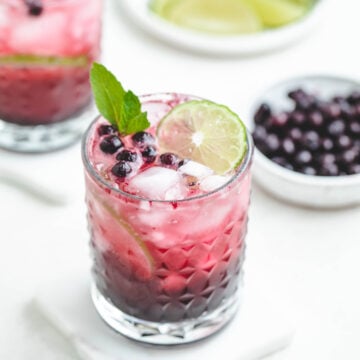 The blueberry syrup is added to the bottom of the glass and then I fill the glass with ice. The sparkling water is poured over top until the glass is almost full. Finish it off with lime juice, then give it a stir. Top it with blueberries, lime slices and fresh mint for the most refreshing mocktail!