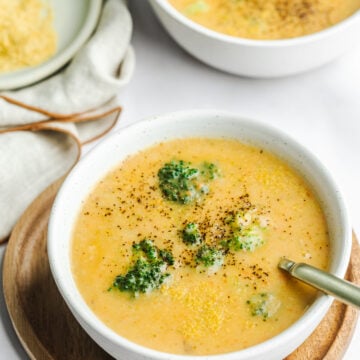 This Healthy Dairy Free Broccoli Cheese Soup is so creamy and comforting and comes together in no time at all. It is a perfect family-friendly recipe (even my insanely picky 3 year old ate it!). Serve it with a piece of crusty bread or a sandwich for the perfect meal.