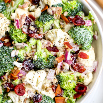 This Easy Broccoli Cauliflower salad is my take on one that I grew up eating. I asked my aunt to make it for me whenever we went to her house for a summer get together. It has texture, flavor, creamy dressing and BACON. It is the perfect side dish for any meal.