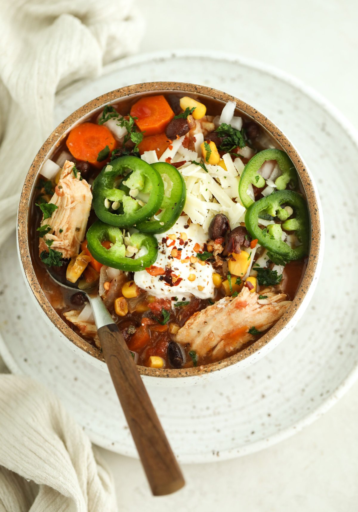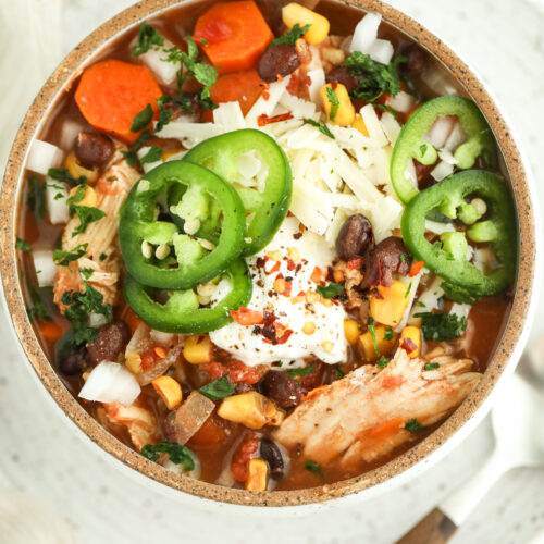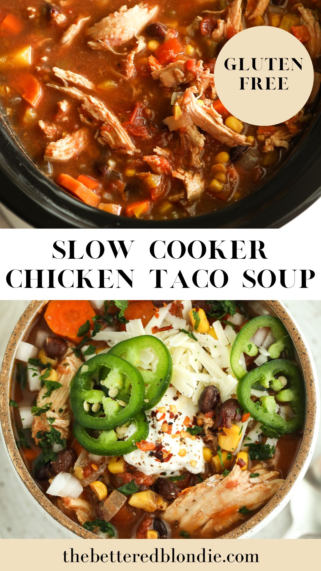 This Slow Cooker Chicken Taco Soup is an insanely easy dump and go dish that is packed with flavor. Tender shredded chicken, delicious veggies and aromatic broth make this soup so cozy and comforting.