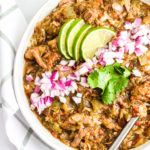 When timer goes off, let the steam naturally release (takes about 30 minutes) and then remove the lid. Mix the tapioca starch with 1 Tbls room temp water and add to the green chili. Turn to saute mode, it will bring the stew to a boil. Let simmer until it thickens up a little then turn off